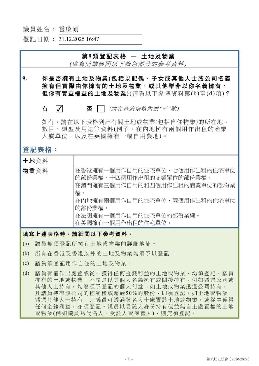 翻查霍启刚上届提交的请教表,他于2022年提到在香港、内地,以及法国和英国领有物业,但未说起数目。霍启刚在2025年7月请教在港岛有4个物业,九龙有10个。