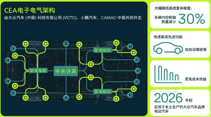 1月28日,大众中国文牍其专为中国商场打造的CEA电子电气架构已按期完成委派,这是大众汽车(中国)科技、CARIAD中国与小鹏汽车配合的重要后果。据大众汽车集团(中国)董事长兼首席推行官贝瑞德先容,自2026年起,国产大众汽车品牌的纯电动车型将搭载全新的CEA电子电气架构——China Electronic Architecture。