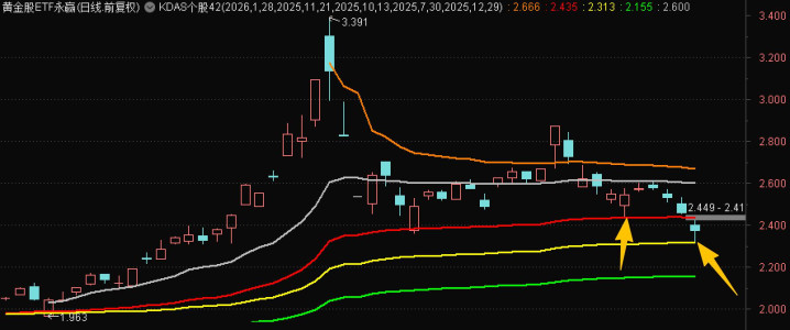 $黄金股ETF永赢(517520)盘前条记在追踪,上周撑执位是KDAS红线,跟着金价走弱,目下下方撑执位KDAS黄线。今天第一次回踩,反弹力度就还行。