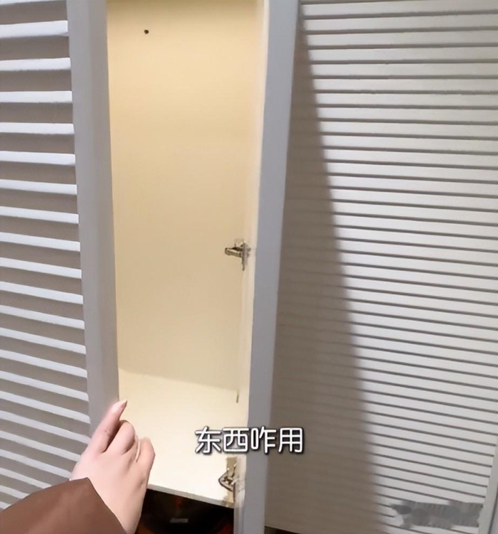 门洞被阴灵门占用约20公分,通行窄小,成年东谈主只可侧身通过,还容易卡顿;鞋帽柜的抽拉鞋架合页装反,开门90度后,鞋架被门板挡住,压根无法取放鞋子;