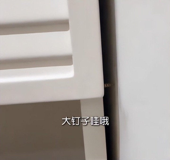 更危急的是,碗篮装配时,施工东谈主员使用的螺丝过长,径直穿透门板,螺丝顶端外露,极易扎伤手;橱柜与墙面的过错最大处达3厘米,用手轻轻一推就会激荡,存在倾倒风险。