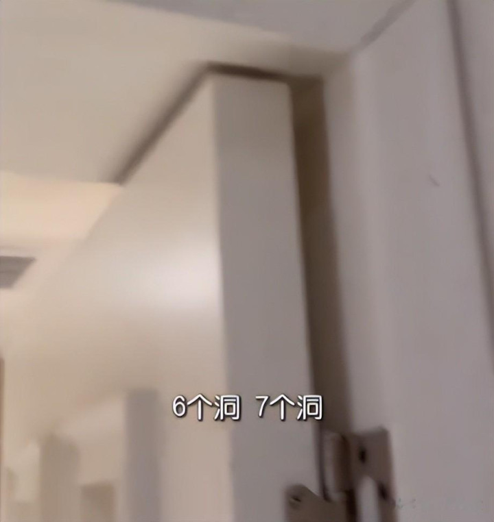 入户与次卫区域相同目不忍见,入户门框上布满密密匝匝的钉眼,莫得任何坎坷,胶线涂抹爽脆误会,呈不法例梯形,施工东谈主员称后续会用腻子修补,但业主检察后发现,钉眼过深,修补后会留住明白陈迹,无法还原好意思不雅。