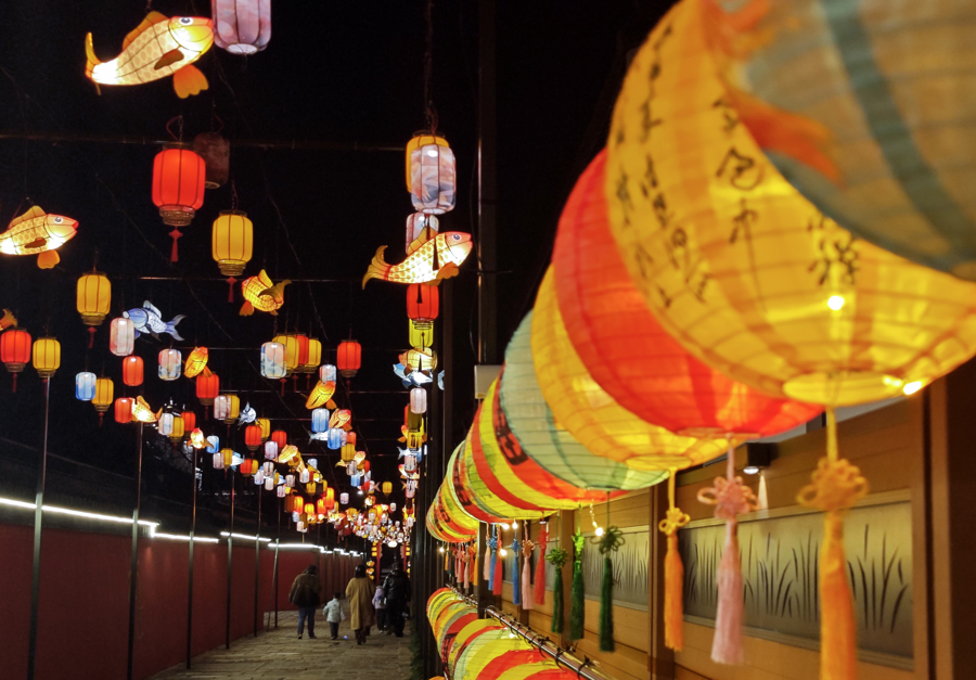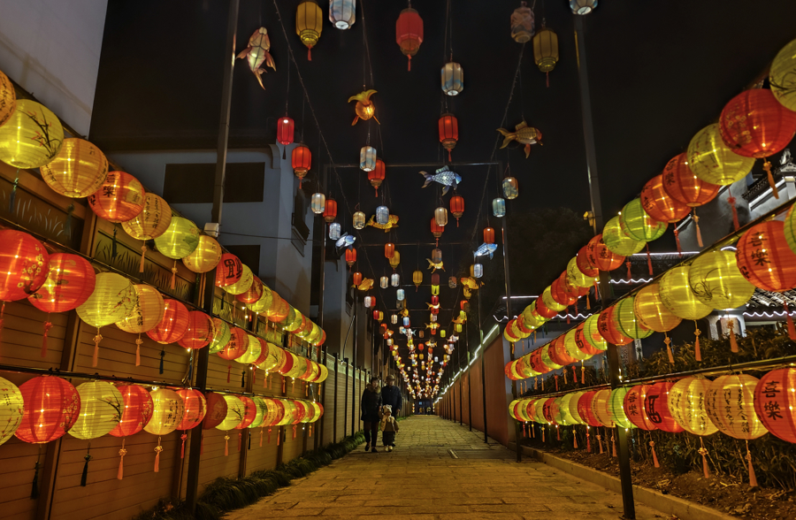 金圃宅第广场上,“兔小布”联名灯组与锦鲤灯组致密温馨。中枢景区三桥广场内,红灯笼与暖光灯带共同勾画出一幅“灯影映水乡”的新春画卷,让古镇充满年味。