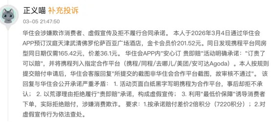 2026年3月5日,有消费者投诉称其于3月4日以金卡会员价201.52元通过华住会APP预订汉庭酒店,同日发现携程临幸型仅165.42元。华住会“定心订贵即赔”承诺携程为协作平台,消费者依功令肯求赔付后,客服却以“非协作平台截图”拒审。投诉指其承诺与实操矛盾,涉嫌邪恶宣传及消费诈骗,要求赔付7220积分并照章查处。放胆2026年3月15日,搜索“华住会邪恶宣传关节词”,暴露投诉量为196条。