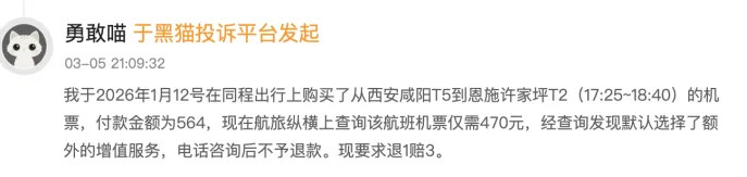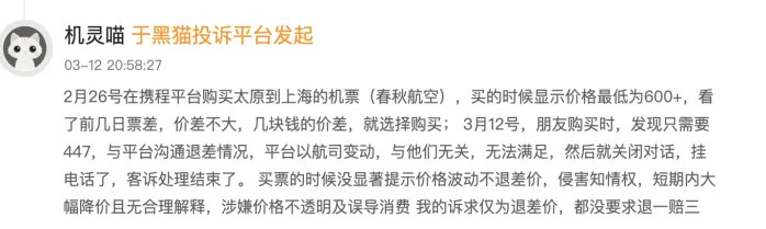 2026年3月12日,有消费者投诉称其于2026年2月26日以600余元在携程购买太原至上海机票,几日后发现归拢航班降至447元,价差超150元。客服以“航司变动”为由隔绝退差并挂断电话。投诉指平台未权臣辅导价钱波动不退差价,涉嫌侵害知情权、价钱不透明及误导消费者。
