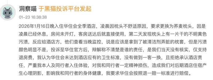 2026年1月,有消费者入住华住会全季酒店,更换的荞麦枕头出现不解黄色污渍,向官方投诉后,华住会仅愉快退房费,隔绝承担卫生不达标包袱,消费者退一赔一的诉求未获恢复。