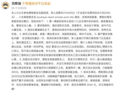 除价钱乱象外,携程在商家协作与践约做事方面也存在稀奇问题。2026年2月2日,有消费者反应,破耗10400元参加携程普吉岛跟团游,产物宣传“全程五星私东说念主泳池别墅、专属导游做事”,本色入住后碰到空调外机杂音、房间卫生差、房门被生分东说念主大开等问题,消费者24小时内理论见知领队,归国后携程否定接获报备,仅愿补偿300元,且有100元红包素养好评的情况。