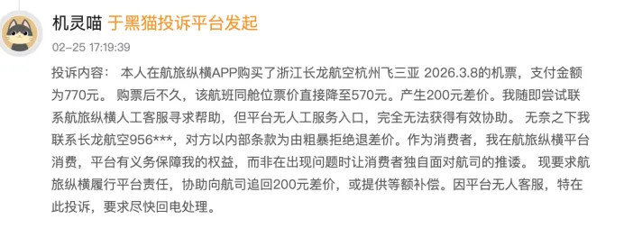 另有别称消费者称于2月25日在黑猫投诉平台反应,其通过航旅纵横APP购买浙江长龙航空杭州飞三亚的机票(2026年3月8日航班),支付金额为770元。购票后不久,该航班同舱位票价降至570元,产生200元差价。该消费者尝试关系航旅纵横东说念主工客服寻求匡助,但平台无东说念主工做事进口,无法获取灵验协助;随后关系长龙航空客服,对方以里面条件为由隔绝退差价。消费者觉得平台有义务保障其权益,要求航旅纵横履行平台包袱,协助向航司追回差价或提供等额补偿。