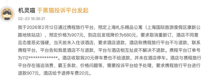 维权要领的推诿扯皮相通是携程投诉的要点。2026年2月,有消费者以907元通过携程预订上海某杰作公寓,到店后发现临幸型价钱降至680元,肯求退订重订遭拒,后续退款时,酒店称需平台操作,携程示意酒店不愉快,两边相互推诿。该消费者未在酒店泊车却被收取20元泊车资,退款诉求未获管制。黑猫投诉数据暴露,携程维权类投诉占比19%,其中超70%触及平台与商家包袱领域蒙胧。