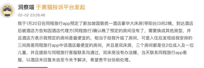 2026年2月2日,有消费者投诉称其于2026年1月20日在同程预订新加坡酒店豪华大床房3间2晚,到店因代理方阐述延伸被换为最便宜的双床房,且每间需住2大1小,无法幽闲需求。关系同程客服后以“酒店未回复”拖延于今。投诉要求协助处理。