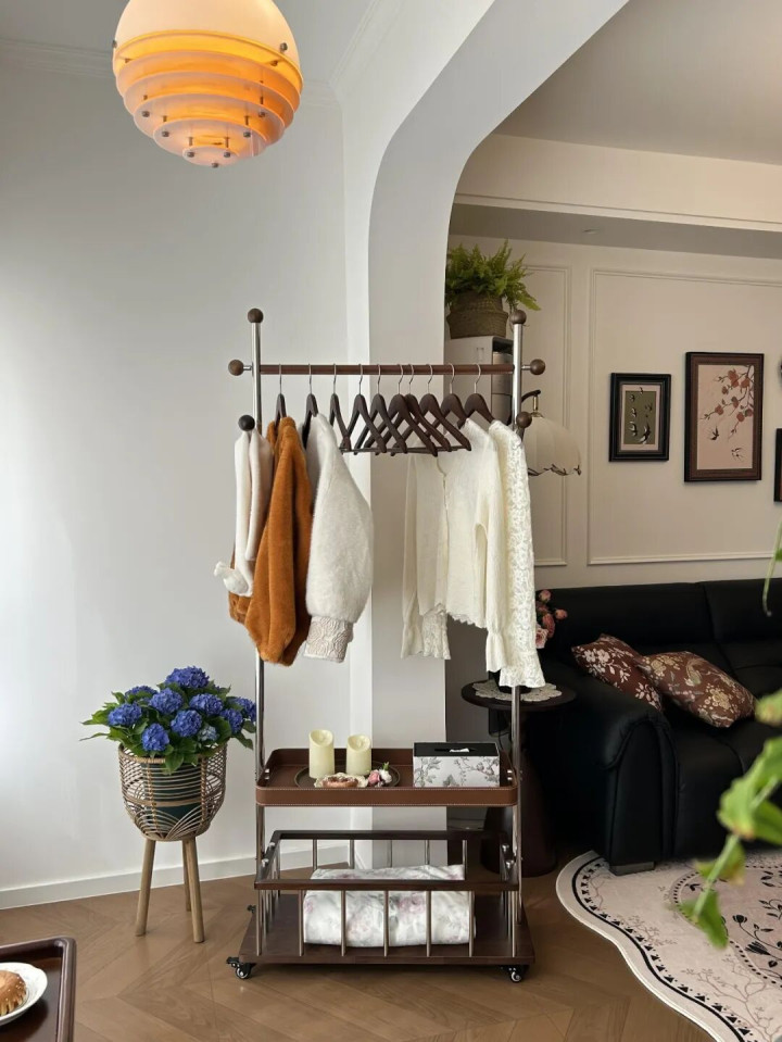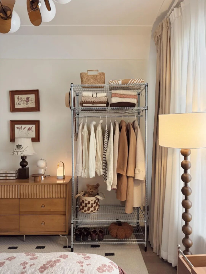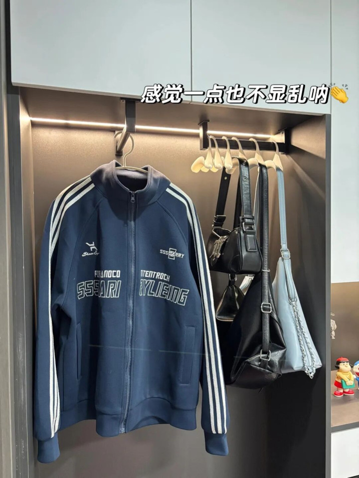 如果依然入住,没预留收纳区,就网购一个制品晾衣架,放在卧室或阳台,极端挂次净衣。