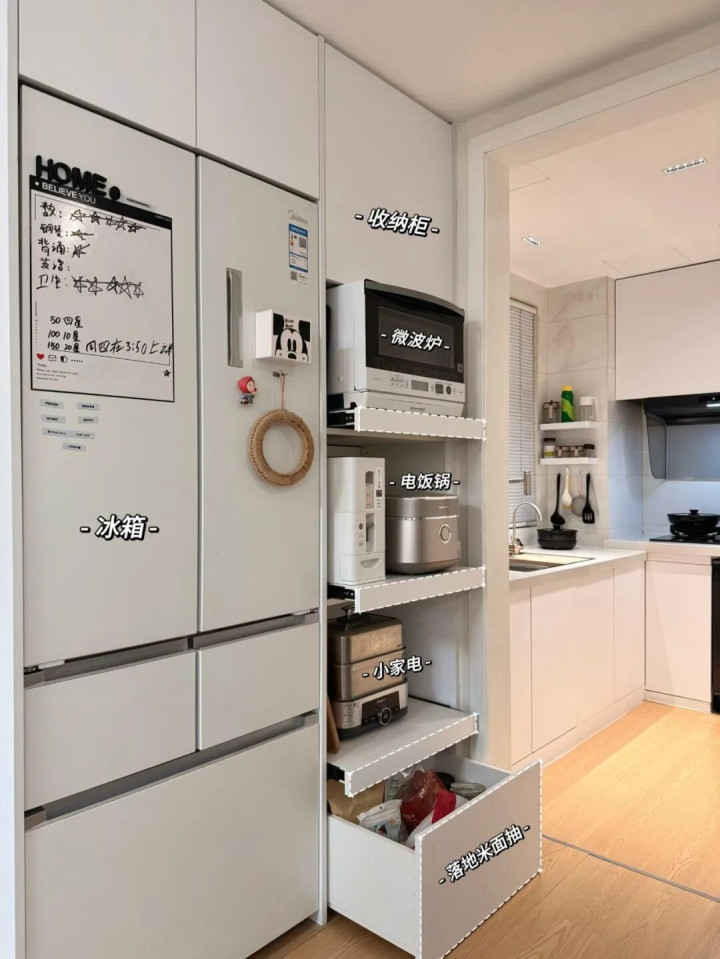 如果装修时磋议到位了,径直打柜子装抽拉板,把小家电放在抽拉板上,用的本事抽出来,无谓的本事推且归,幸福感愈加爆棚!