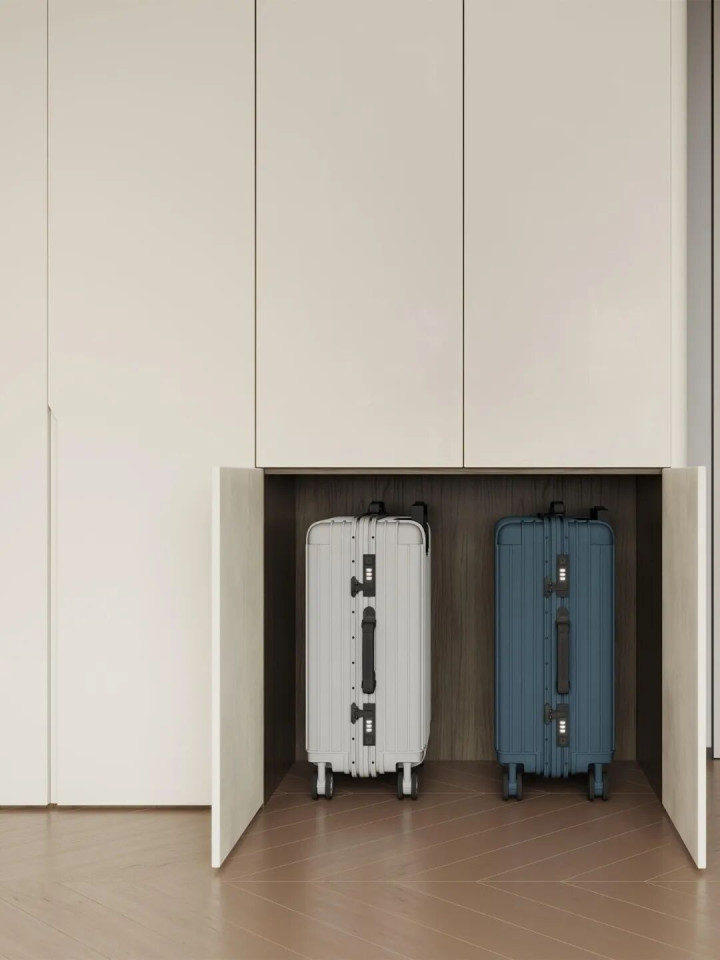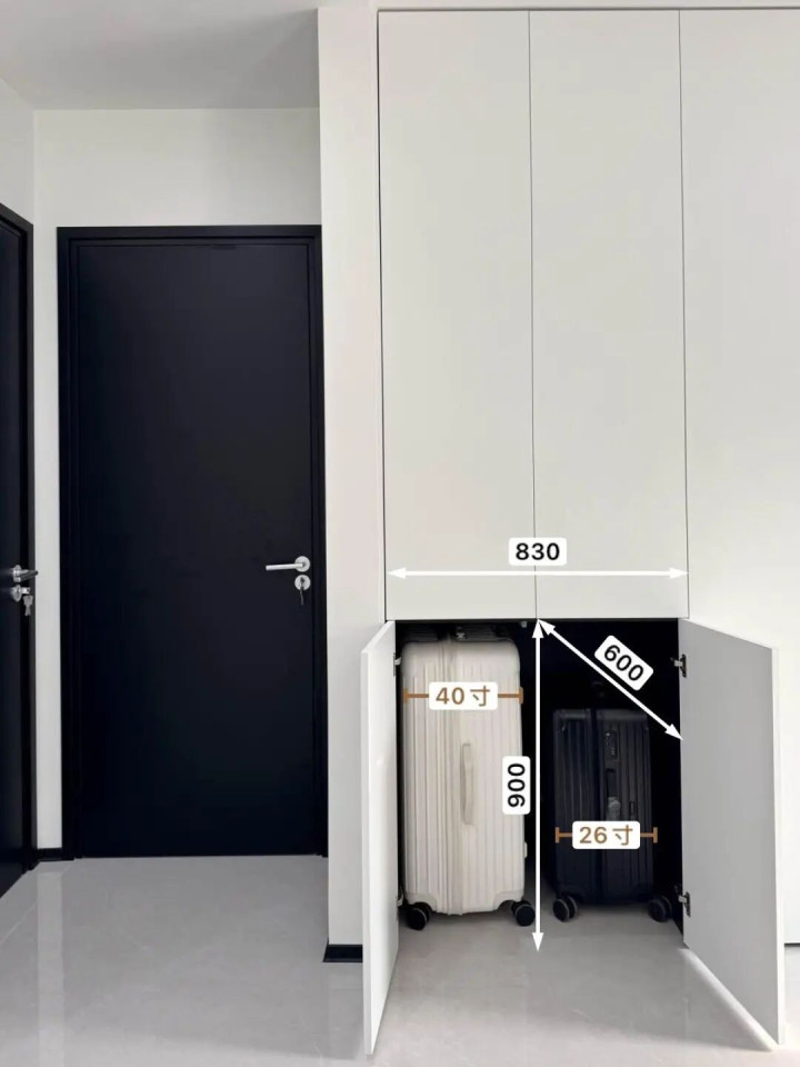 不错在离入户门近的场所,定制一个无底柜,凭证你家行李箱的大小留空,别作念底板,径直把行李箱塞进去,关门后从外面看整整皆皆,拿取也便捷。
