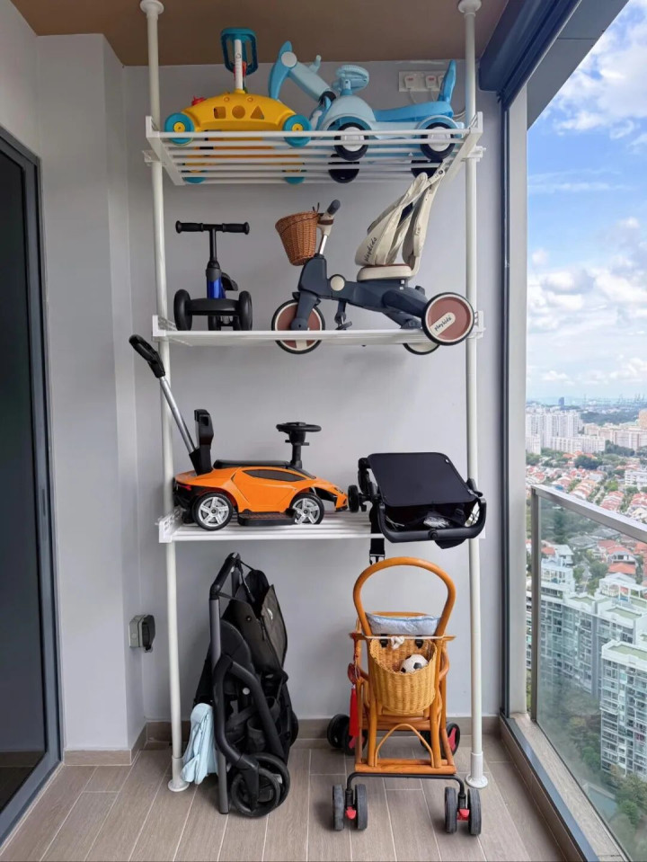 如果依然入住,没预留这个空间,就网购一个顶天赶紧的收纳支架,把娃的玩物、小推车都挂起来。