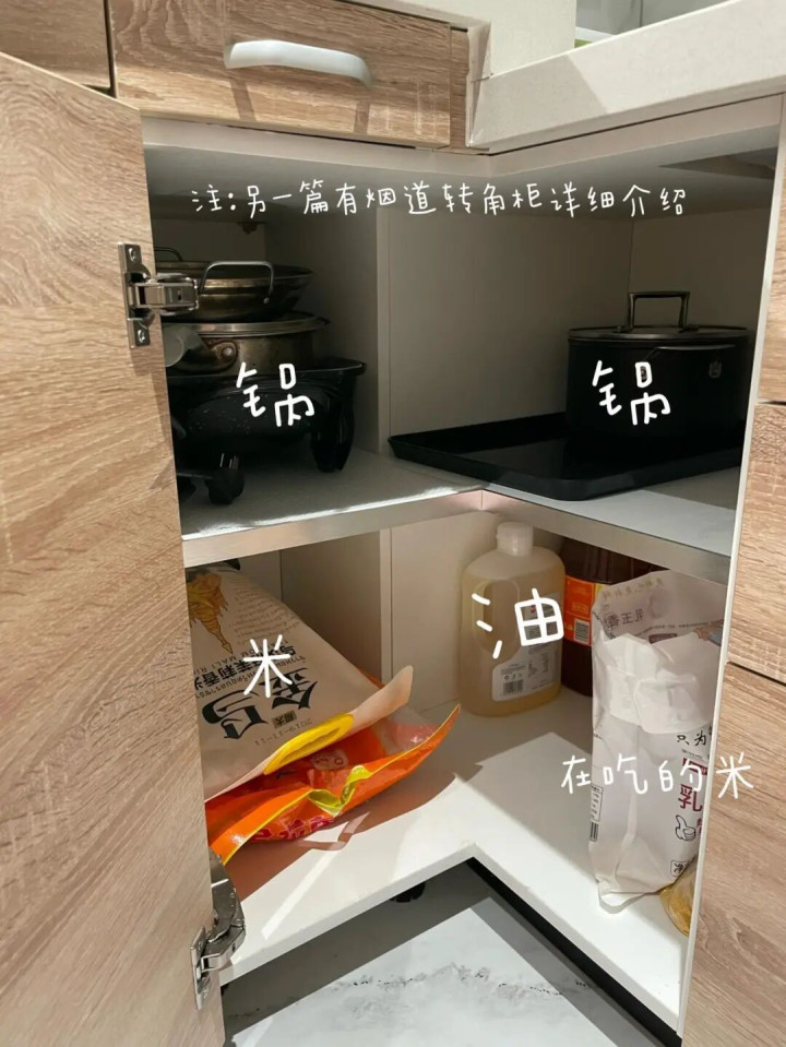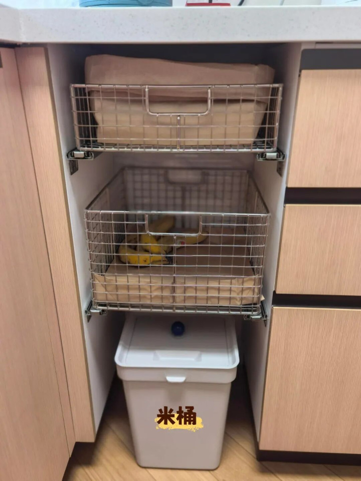 定制橱柜时,预留几个深度饱胀的落地格子,极端放米、油、面粉、锅具这些大件就行。