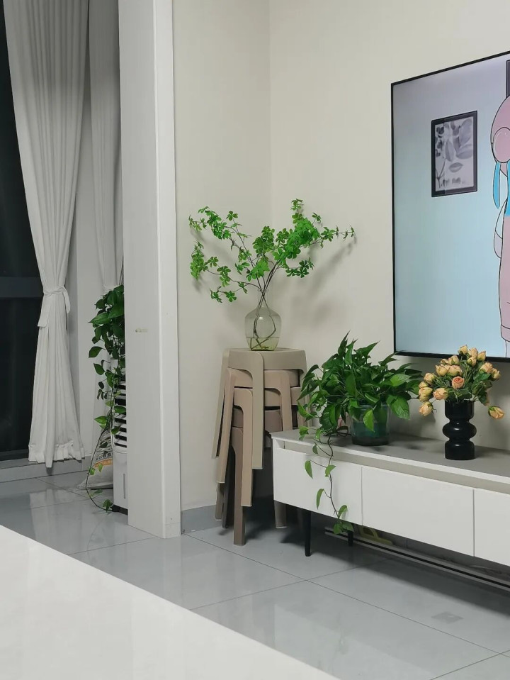 如果依然装修完,没预留这个空间,就把凳子叠放起来,上头用布罩着,找个边缘放,上头还能摆盆绿植隐藏一下,也总比乱堆乱放强!