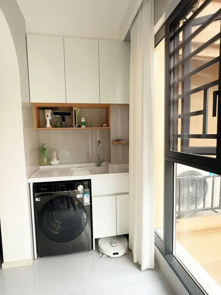 最保举放在阳台柜的洗衣机把握,预留一个小格子,既能荫藏扫地机器东说念主,又能便捷换水,不占场所、不影响颜值。