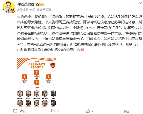 直播吧04月27日讯闻明辩驳员詹俊在社媒发文,谈到阿森纳在赛季冲刺阶段的威望安排。