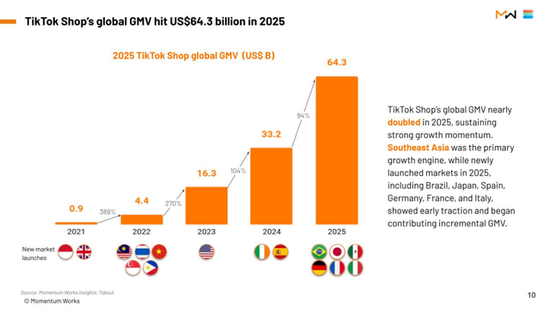 据新加坡风投契构Momentum Works聚会视频商务数据平台Tabcut发布的TikTok Shop阛阓敷陈,2025年TikTok Shop电买卖务遮掩16个阛阓,大家GMV达到643亿好意思元(折合东说念主民币约4444亿元),同比暴涨94%。