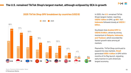 具体来看,好意思国依然是TikTok Shop最大单一阛阓,GMV达到151亿好意思元;但增速有所放缓,同比增幅约68%。
