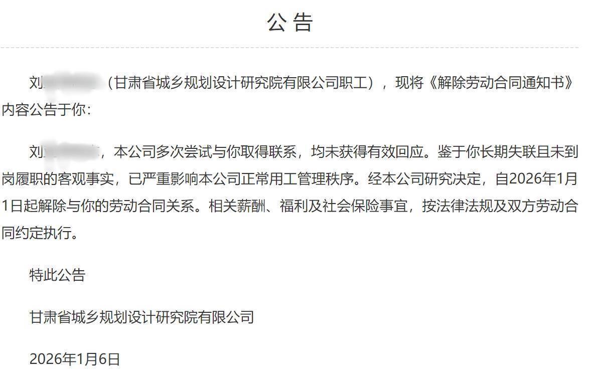 甘肃经济日报公告表露,刘某某是甘肃省城乡琢磨筹谋考虑院有限公司职工。本公司屡次尝试与其考虑,均未得回灵验回话。鉴于其长久失联且未到岗履职的客不雅事实,已严重影响本公司闲居用工解决顺次。经本公司考虑决定,自2026年1月1日起撤消与其的劳动协议关系。干系薪酬、福利及社会保障事宜,按法律法例及两边劳动协议商定本质。