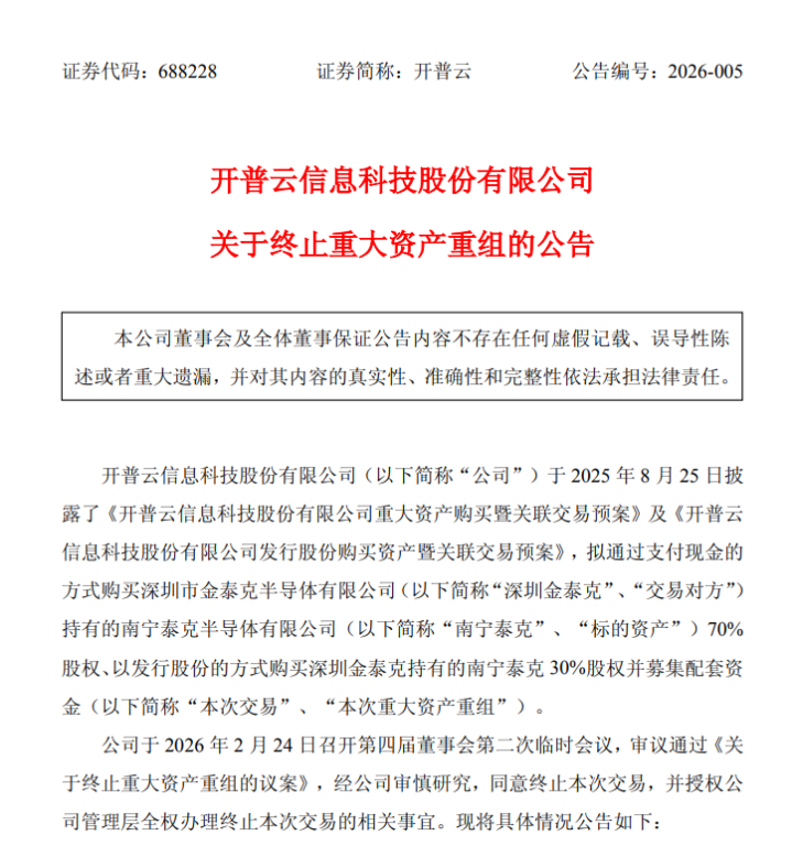 据开普云公告,这次重组失败,是受市集环境变化影响,交游两边未能就交游中枢条件达成一致敬见。基于审慎性谈判,为切实治愈公司及整体激动利益,经公司董事会充分审慎商榷,充分论证,决定隔断本次首要财富重组事项。