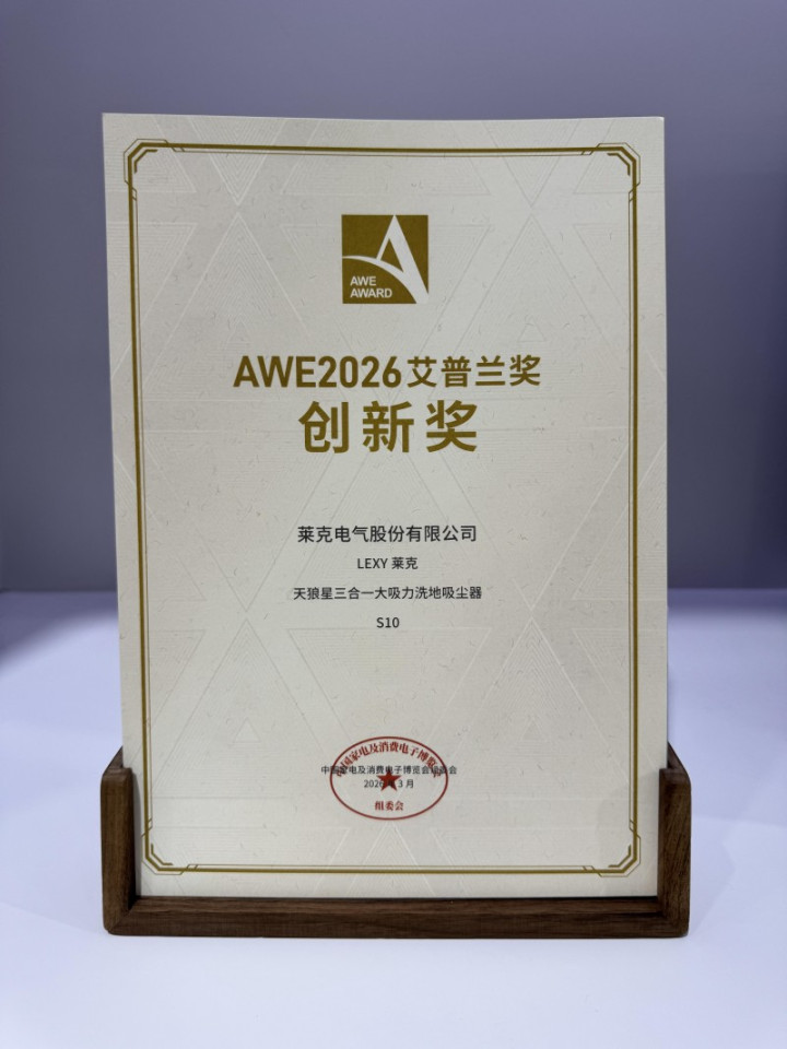 凭借这种不凡的翻新实力,莱克天狼星S10套系产品在AWE2026展会上脱颖而出,一举夺得备受瞩见识“艾普兰翻新奖”,并获取了行业泰斗机构授予的 “三合一洗地吸尘器创始者” 认证。