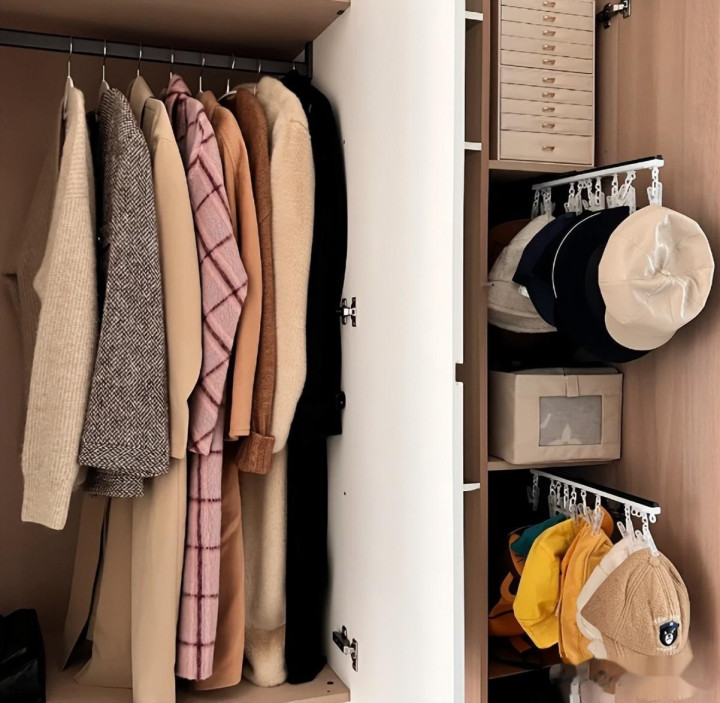 衣柜的侧面便是一个“黄金区域”,这里野心好,刚巧能用来收纳家居服,本日穿的衣着。