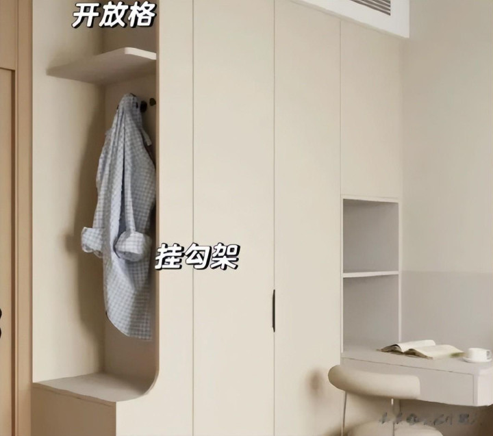 在衣柜侧面作念了一个次净衣区,在中间挂一个衣杆,你能把寝衣、半袖等等齐挂在上头。