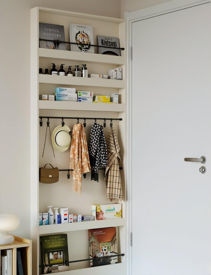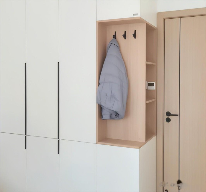门后的位置我也莫得放过,径直在靠墙的位置打造了一个破绽柜,不影响开关门,还能收纳,