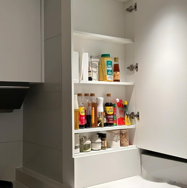 这个柜子刚巧用往来收纳厨房常用的调料,距离灶台也近,唾手就能拿到,好意思不雅不占场所。