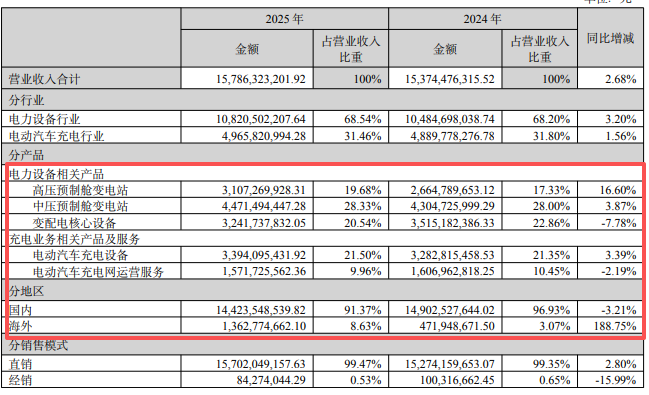 电力开发业务一直是特锐德的主力复旧。年报露出,2025年,该板块已毕交易收入108.21亿元,同比增长3.20%,但净利润达10.06亿元,同比增幅高达41.89%,利润增速远超营收增速。其中,高压预制舱变电站表示尤为亮眼,营收31.07亿元,同比增长16.60%。