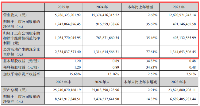 年报数据露出,特锐德2025年已毕交易收入157.86亿元,同比增长2.68%;归母净利润达12.43亿元,同比大增35.62%,扣非净利润增长35.46%至10.35亿元。
