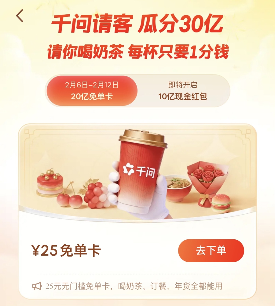2月6日,阿里千问肃穆上线“春节30亿免单”行为,通盘用户独一下载千问并更新至最新版,王人可领取1张25元无门槛免单卡。通过千问叫外卖、点奶茶,可奏凯抵扣25元,只需要记号意旨支付1分钱。