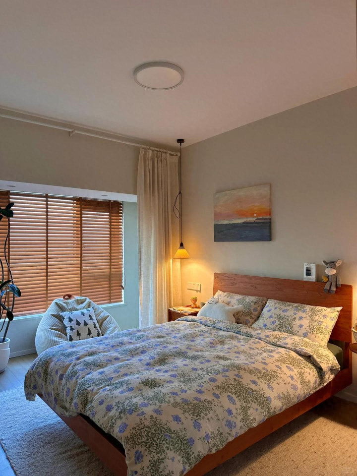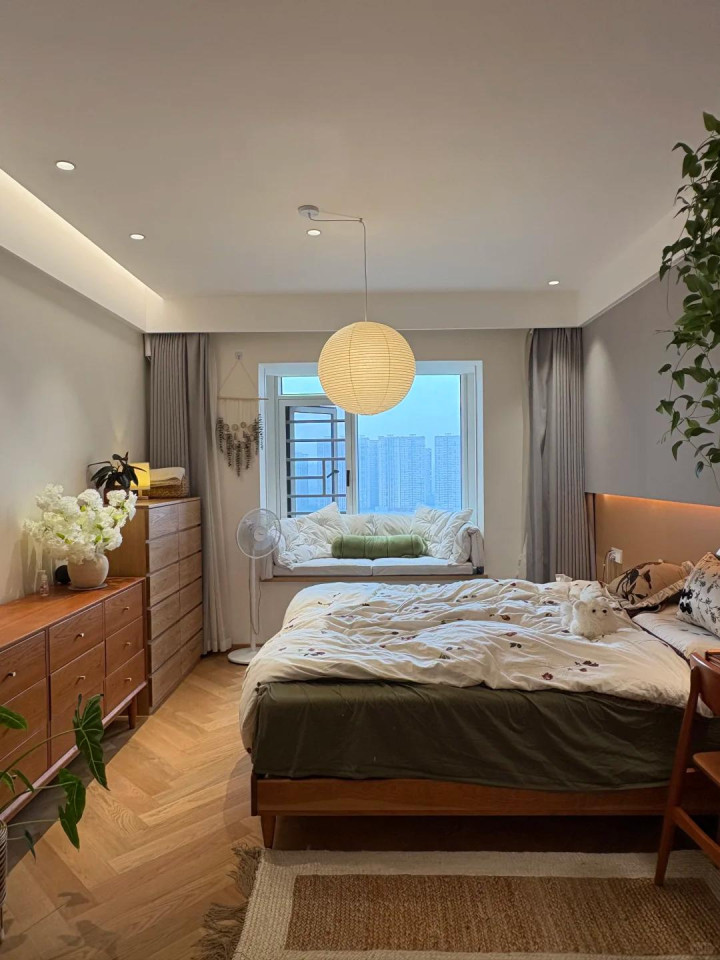 一个卧室好不颜面,灯光完竣是灵魂,不要只装一盏大吸顶灯,我之前第一套屋子就踩过坑,买了一盏大吸顶灯,晚上开着至极夺目,东说念主根蒂减轻不下来,更别说助眠了。