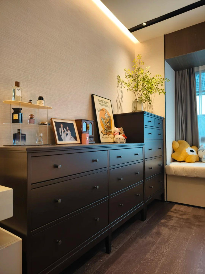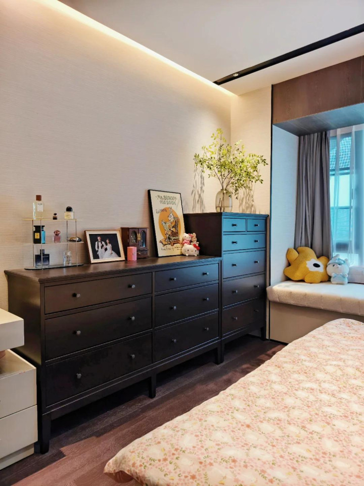 要是卧室空间允许,一定要在床尾或者是床的侧面加一个五斗柜或者边柜,果真至极实用。我家卧室就放了一个5斗柜,闲居用来收一些内衣或者袜子这么的的小物件,不错让卧室陡然整洁不少。