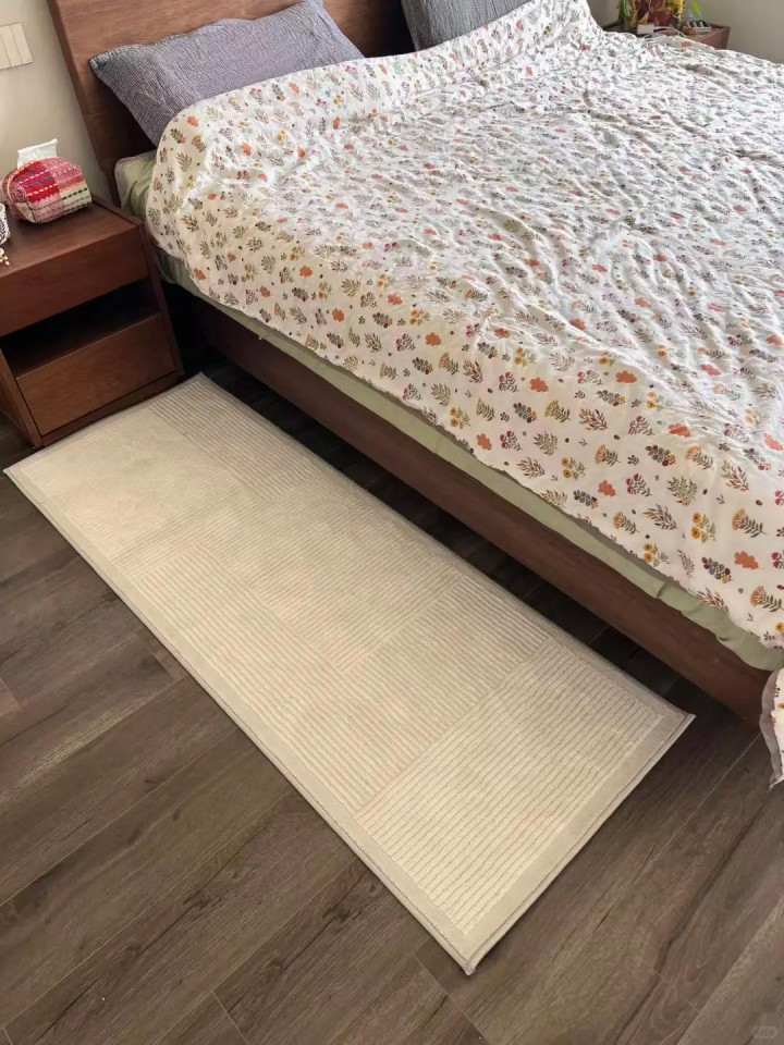 要是也曾铺完瓷砖了的,也不要慌,在床的双方或者床尾的位置铺一块长条地毯,也能援助一下。许多設計师会保举大块的地毯,固然颜面,然而很难收拾。提议选羊毛的,踩上去更舒畅。