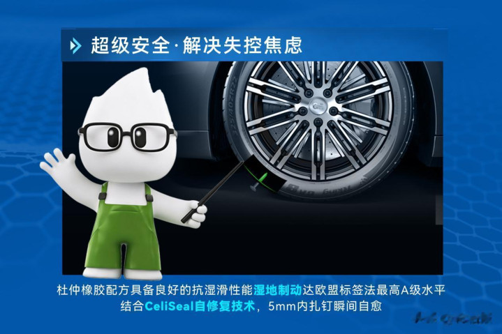 杜仲胶配方趋附溶聚丁苯与高区别白炭黑,进展出优异的抗湿滑性能,超等杜仲轮胎的湿地制动性能达到欧盟标签法最高品级(A级)圭表。合营CeliSeal自设置技巧,轮胎碰到5mm以内扎钉时可达成一会儿自愈,信得过作念到抗扎防爆,为雨天、湿滑及复杂路况下的每一次出行筑牢安全防地。