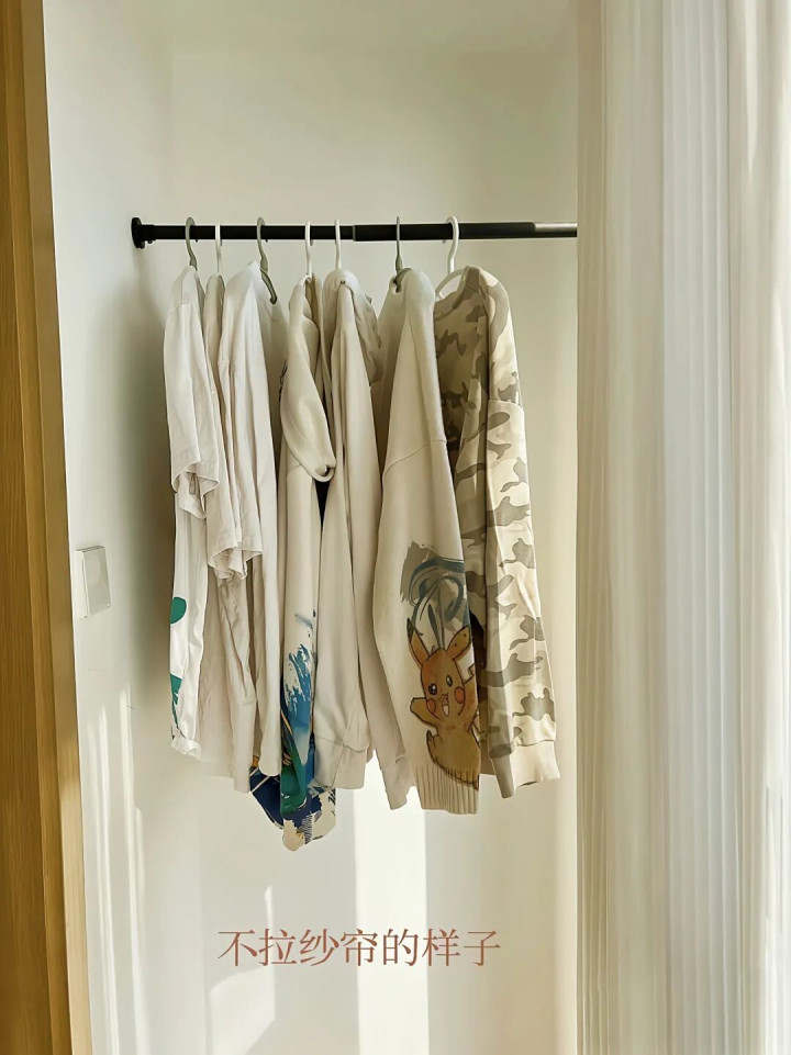 若是你是个对细节条目极高的屋主,还可以在晾衣架前边加上布帘,让穿着“隐身”。