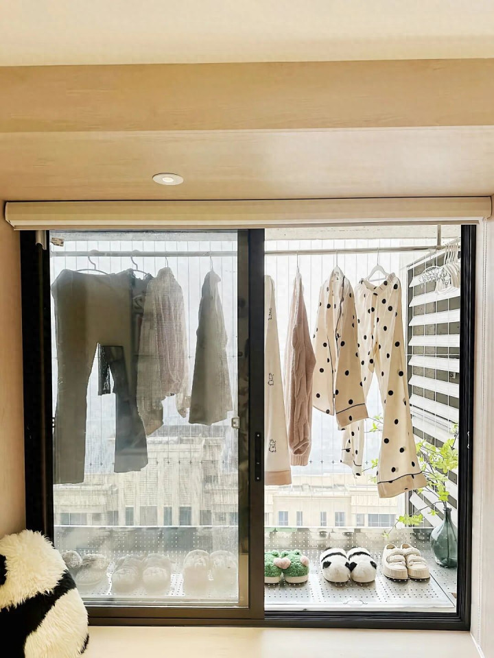 这位业主并莫得选用传统的阳台来晾穿着,而是奥秘地诳骗卧室的飘窗外,在空调外机的平台上,盘算了一个既安全又整洁的晾衣空间。