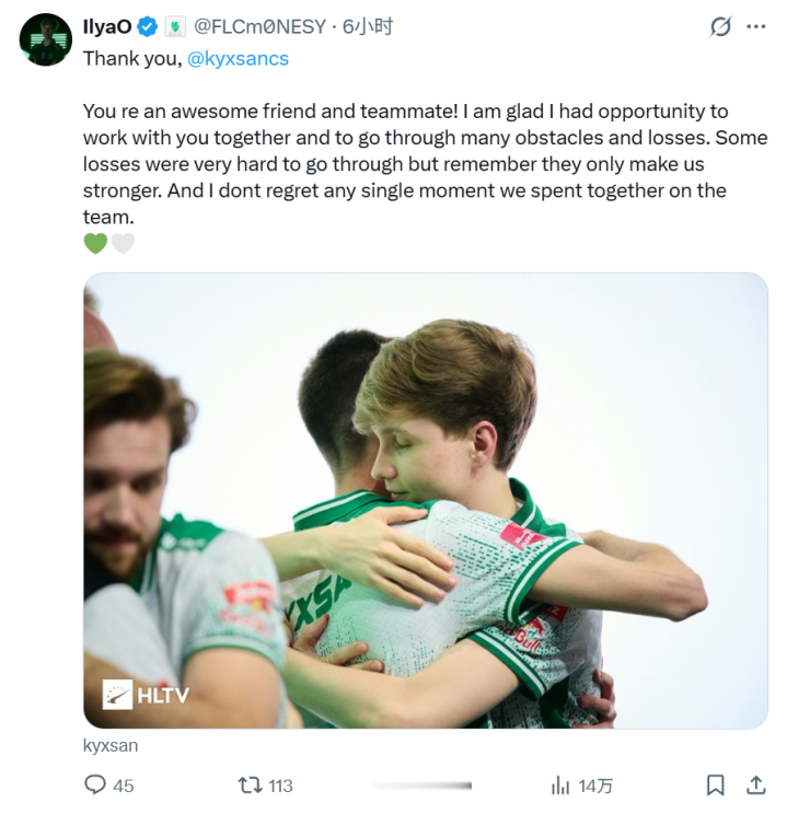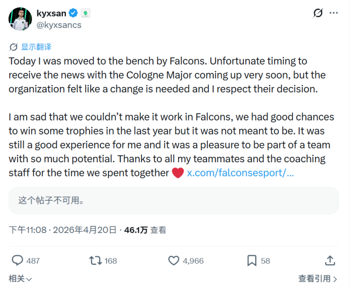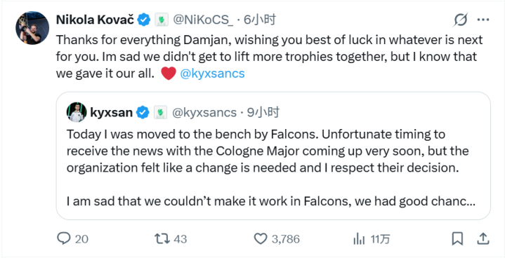 kyxsan本东说念主发文证明我方被下放:“今天我被Falcons移到了替补席。收到这个音信的时机很不巧,科隆Major立地就要来了,但俱乐部以为需要作念出编削,我尊重他们的决定。我很酸心咱们在Falcons没能赢得告捷,昔日一年咱们有好几次契机赢得奖杯,但事与愿违。这对我来说仍然是一次很好的资格,很欢跃能成为一支充满后劲的队列的一员。感谢所有队友和素养组。”