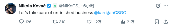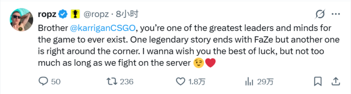 ropz则向我方的老队长问候:“昆季@karriganCSGO,你是有史以来最伟大的带领者和游戏头脑之一。一个别传的故事在FaZe放手了,但另一个别传的故事行将开动。我祝你一切胜仗,但别太胜仗,唯有咱们在干事器上是敌手”