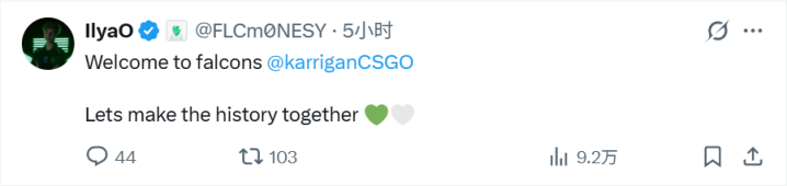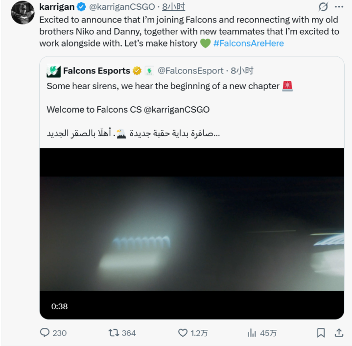 karrigan发布推文:“很慷慨地通知我加入Falcons,并与我的老昆季NiKo和Danny重聚,还有新队友们。让咱们沿途创造历史。#FalconsAreHere”