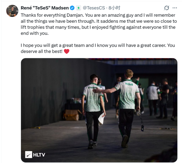 TeSeS写说念:“谢谢你的一切,Damjan。你是个了不得的东说念主,我会记取咱们沿途资格的所有事情。让我酸心的是咱们那么屡次如斯接近捧起奖杯,但我很享受和你沿途战役到临了一刻。你值得最佳的一切!”
